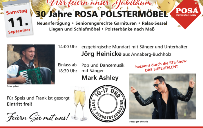 30 Jahre Posa 30 Jahre Posa 30 Jahre Posa zurück zu Aktionen 30 Jahre Posa September 2021 Es ist wieder soweit! Am 11. September laden wir ab 14.00 Uhr ein, um 30 Jahre POSA Möbelsysteme zu feiern. Genießen Sie Ausstellung und Rabatte. Für Verpflegung ist durch einen Imbiss gesorgt. Ab 18:30 Uhr beginnt der Einlass zum Pop- und Dance-Musik Abend mit Sänger Mark Ashley!